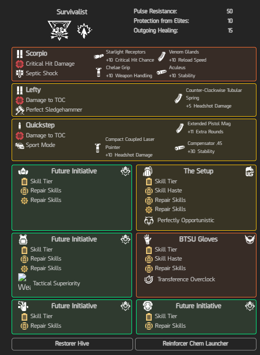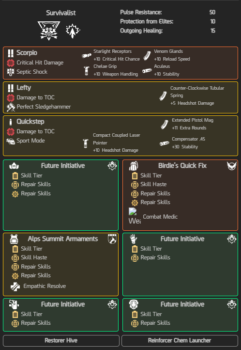 - Attributi secondari: 5x Abilità riparazione, 1x Rapidità abilità, 1x Danno Critico, 1x Probabilità di colpo critico