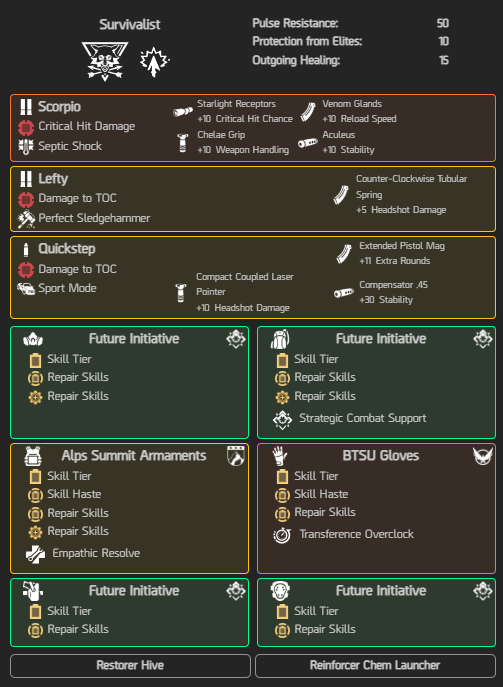 Trovate la lista delle build cliccando nei seguenti pulsanti. Se non sapete come ottenere i vari oggetti per la build, basta dare uno sguardo alle pagine dedicate a equipaggiamenti, ecc… nel sito (esplorate la sezione The Division 2 dal menù arancione!)