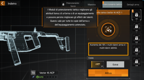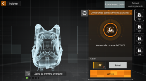 Il potenziamento tattico si fa dall’Armeria, serve a potenziare ulteriormente gli attributi di armi e equipaggiamenti, e possono anche migliorare gli effetti dei talenti. Questi potenziamenti valgono per tutte le copie degli oggetti potenziati.