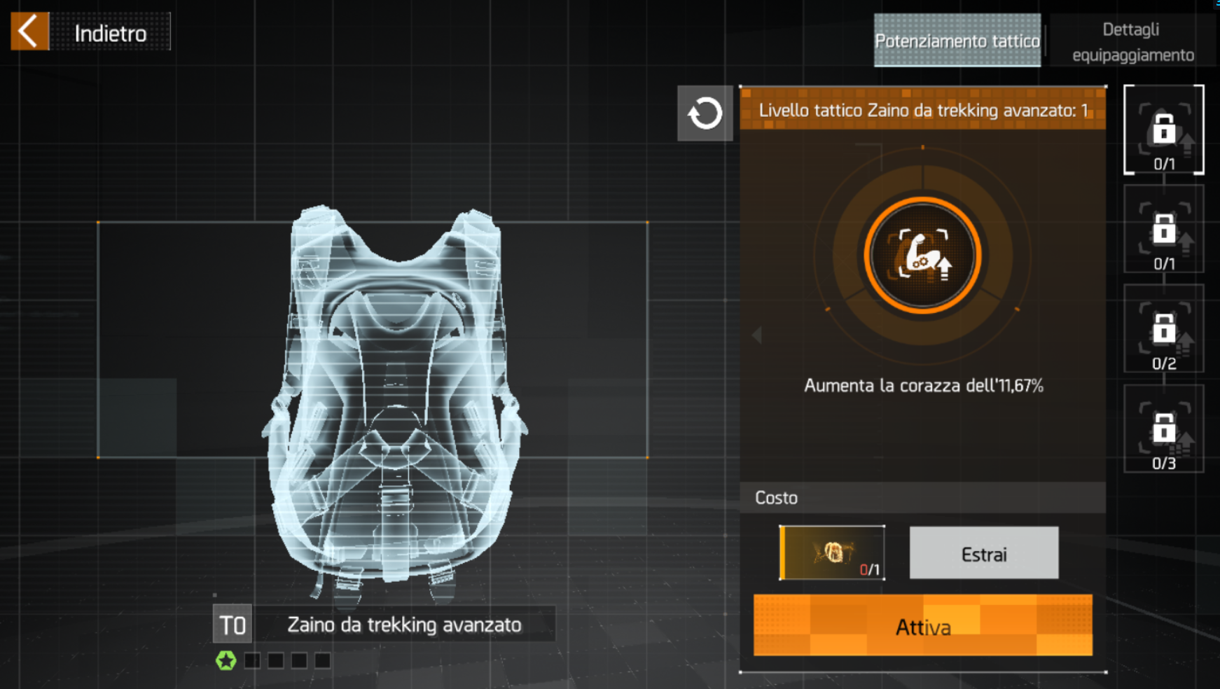 Il potenziamento tattico si fa dall’Armeria, serve a potenziare ulteriormente gli attributi di armi e equipaggiamenti, e possono anche migliorare gli effetti dei talenti. Questi potenziamenti valgono per tutte le copie degli oggetti potenziati.