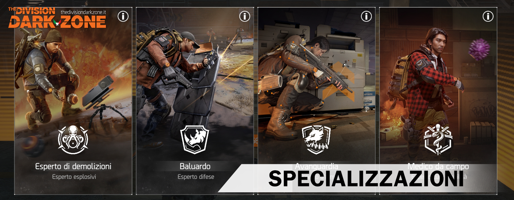 Le prime quattro specializzazioni proposte dal gioco sono: Avanguardia, Baluardo, Esperto di demolizioni e Medico da campo. Non sono le uniche specializzazioni presenti però, avanzando nel gioco sarà possibile sbloccarne altre con il “Sigillo richiesta per specializzazione” a partire da Operatore Tecnico, e verranno inserite nuove specializzazioni con vari aggiornamenti del gioco.